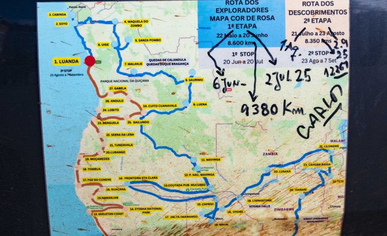 Segunda etapa (1 de Agosto a 2 de Setembro): Maputo-Luanda, refazendo a rota das Descobertas em sentido inverso, com Carlos, Ana e Tetiana — 12.287 quilómetros.