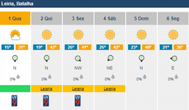 Sociedade Previsão de 42º C para a Batalha e Porto de Mós, e 41º C para cidade de Leiria nos próximos três dias 1 ago 2018 Segundo o Instituto Português do Mar e Atmosfera (IPMA), apenas na segunda-feira as temperaturas deverão baixar.